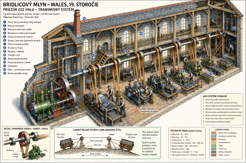 Podobný systém transmisie na pohon strojov pre opracovanie bridlice bol použitý aj v továrni na spracovanie bridlice v Marianke.